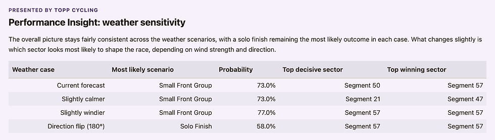 In the women's race, a small group fought out the win in ~80% of outcomes regardless of wind direction. And the decisive sector wasn't the climb itself, it was the exposed segment immediately after it, where wind effects were strongest.